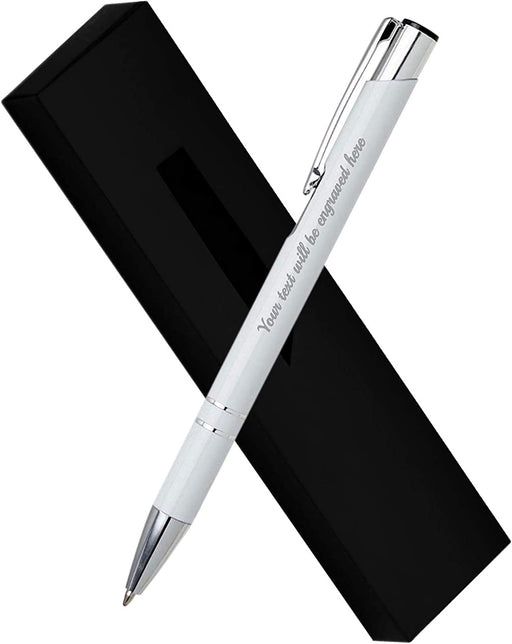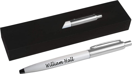 Personalised Engraved White Ballpen with Silver Trim in Gift Box or Velvet Pouch with Refill Options