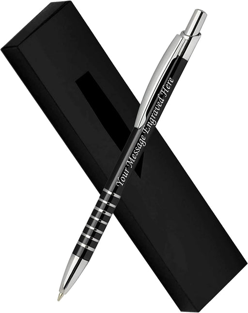 Personalised Engraved Black Aluminium Ballpoint Pen with Striped Silver Trim and Presentation Box