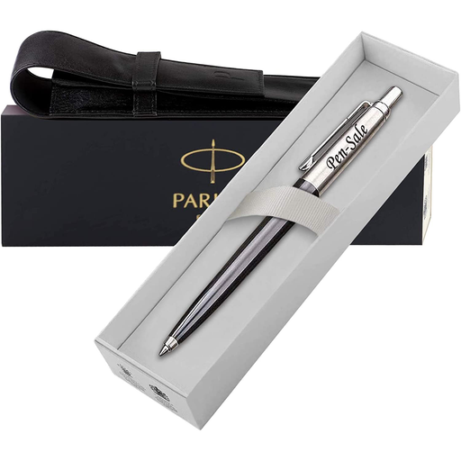 Personalised Engraved Parker Jotter Stainless Steel Ballpoint Pen in Gift Box and Genuine Leather Pouch