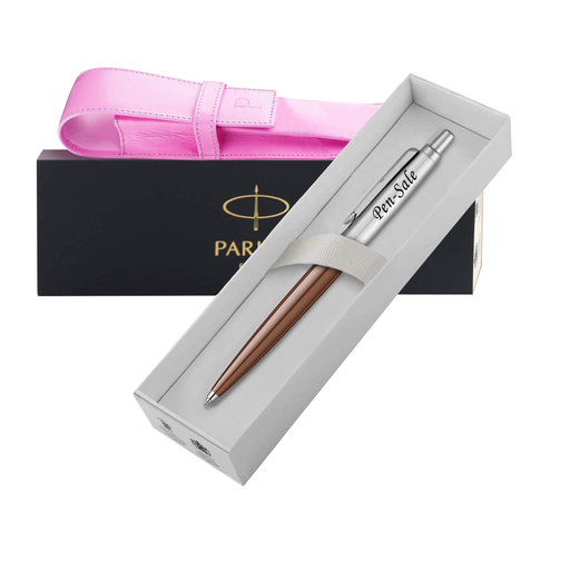 Personalised Engraved Parker Jotter Brown Ballpoint Pen in Gift Box and Genuine Pink Leather Pouch