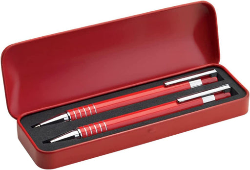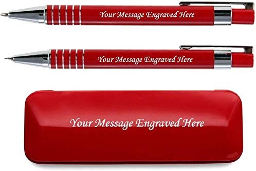 Personalised Engraved Red Pen and Pencil Set with Silver Trim in Engraved Red Case