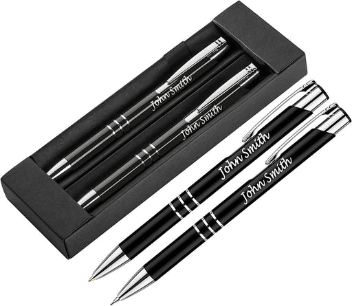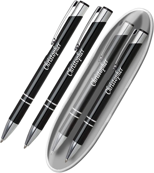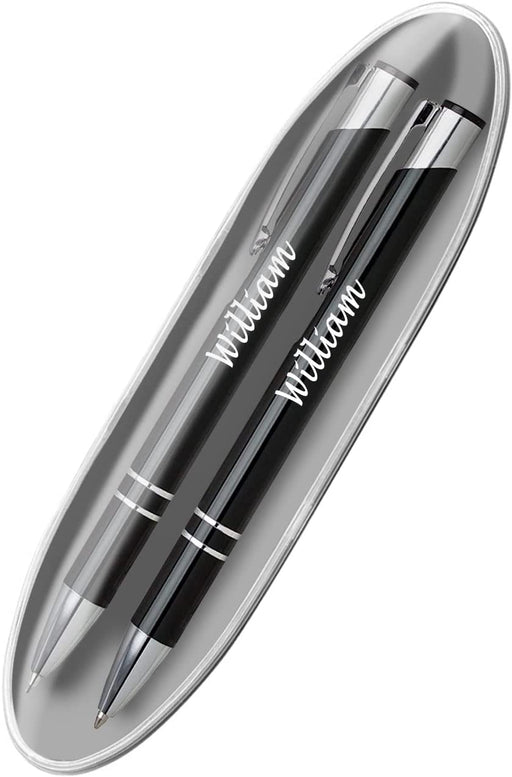 Personalised Engraved Black Pen and Pencil Set with Silver Trim in Engraved Black Case