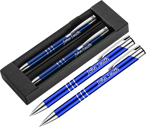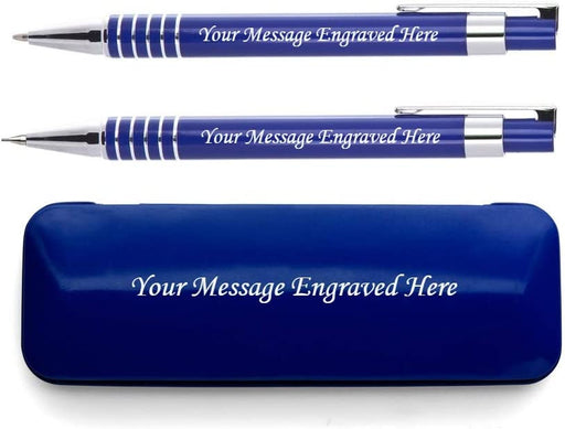 Personalised Engraved Blue Pen and Pencil Set with Silver Trim in Engraved Blue Case