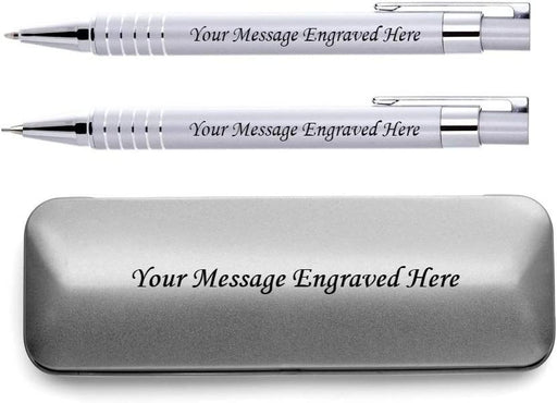 Personalised Engraved White Pen and Pencil Set with Silver Trim in Engraved White Case